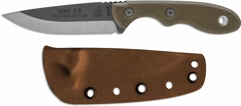 The MSK-TBF TOPS Mini Scandi Knife Rockies Edition, is a compact, easily concealable neck knife, designed by Leo Espinoza (based on the ever popular B.O.B. BROS-01), that features a 3.0 inch drop point fixed blade made of 1095 steel, .130 inch thick, with a Rockwell hardness of 56-58. The blade has a modified Scandi Grind with sharpening notch, Tumble Finish, and a notched thumb rest for secure grip and precise control. The Mini Scandi Knife has full tang construction for strength; ergonomic green canvas Micarta scales and a lanyard hole. A Coyote Tan Kydex neck sheath is included. The TOPS Knives Mini Scandi Rockies Edition has an overall length of 6.13 inches, and it weighs 2.2 ounces; 3.7 ounces with the sheath. Made in the USA.