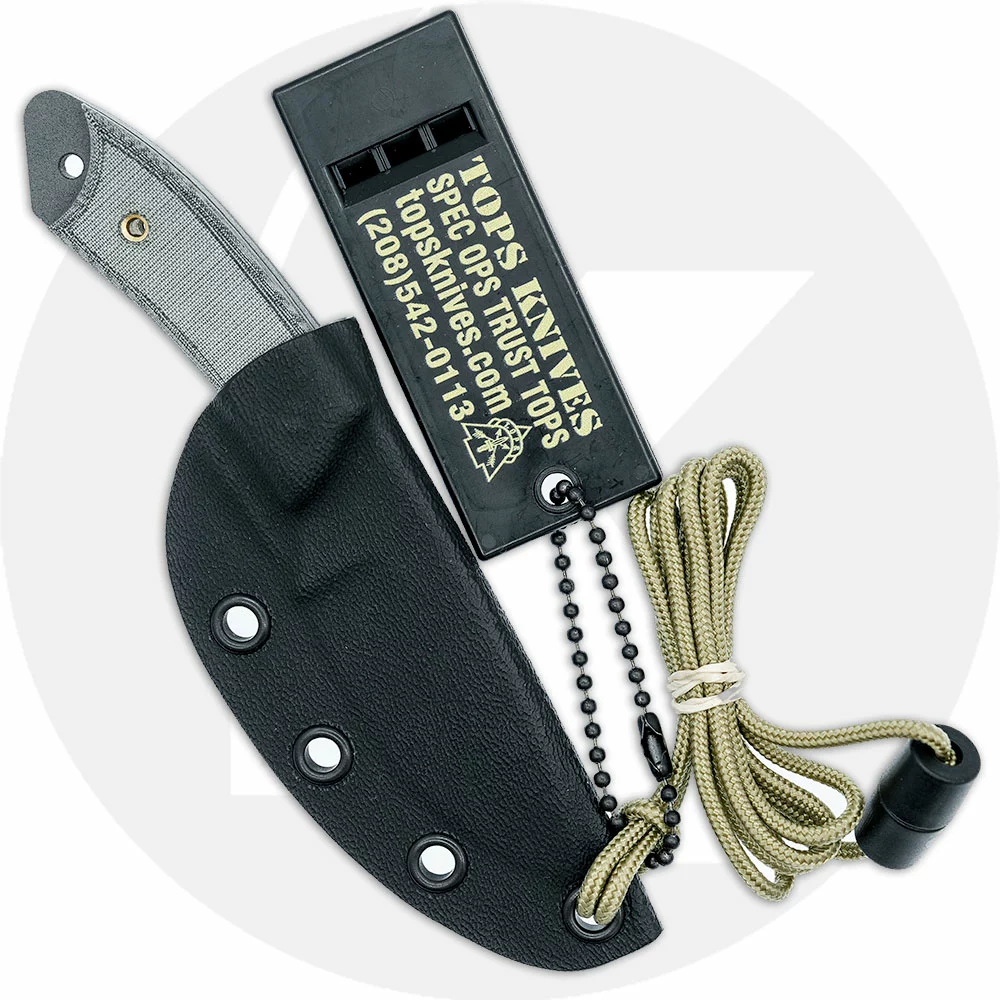 The SPH-01 TOPS Sparrow Hawke is a compact workhorse of a neck knife that features a 2.63 inch Hunters Point fixed blade made of 1095 steel, .130 inch thick, with a Rockwell hardness of 56-58. The blade has a 2.25 inch cutting edge, a non reflective Tactical Gray finish, and a notched thumb rest for secure grip and precise control. The Sparrow Hawke has full tang construction for strength; black linen Micarta scales, and an exposed tang pommel with integral lanyard hole. A black Kydex neck sheath with ball chain is included. The TOPS Knives Sparrow Hawke has an overall length of 5 inches, and it weighs 1.8 ounces; 3.2 ounces with the sheath. Made in the USA.